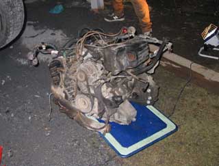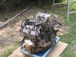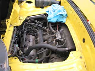 | 搭載。上の写真と比べるとまるっきり色が違います。エンジンルーム自体根本的に汚いので普通ならここから洗剤で洗って、水かけるのですが・・・助手席側の後ろにECUがあるので有る意味で危険です。 普通はエンジン搭載状態での洗浄なのでこんな感じになれば私的にもOKかと。 |